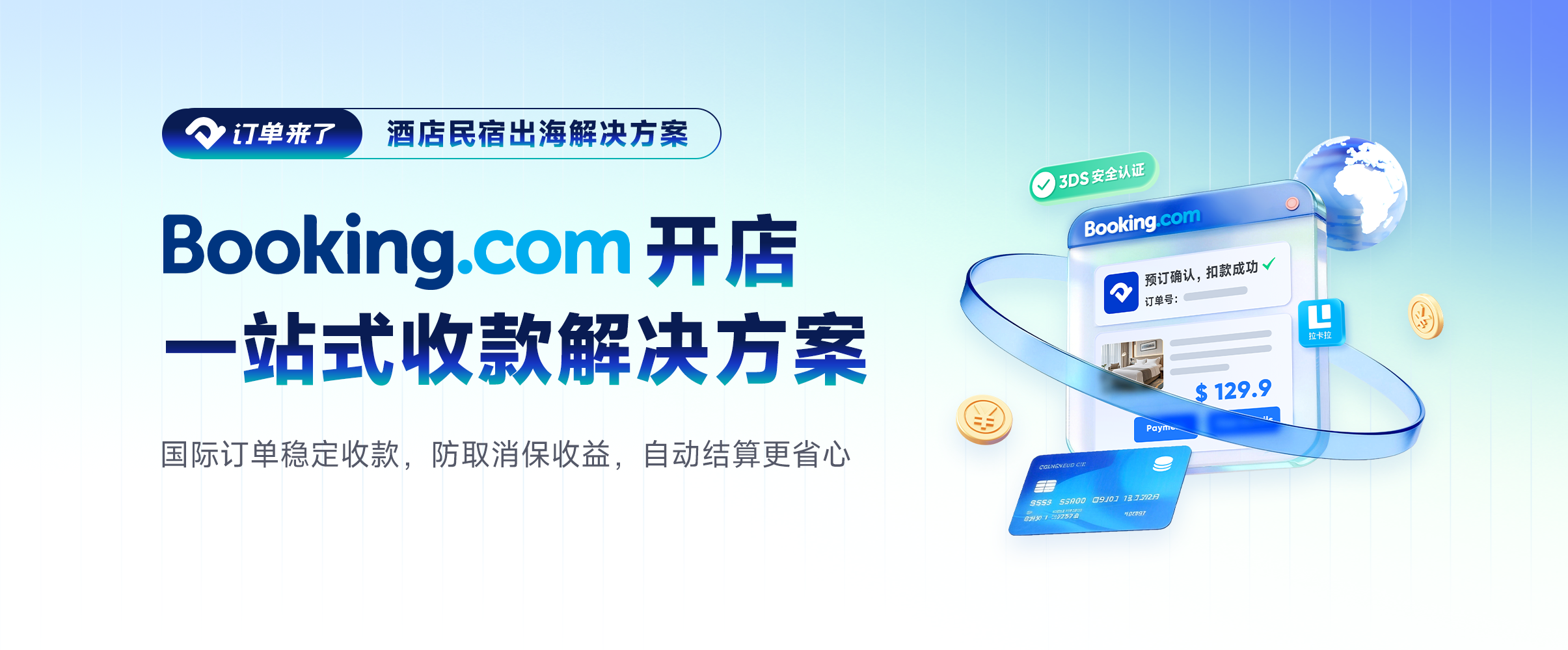 订单来了与全球知名在线预订平台Booking.com和国内领先支付企业拉卡拉联合推出中国酒店民宿出海收款解决方案。通过无缝开店流程、3DS认证技术、自动扣款和代缴佣金等一站式服务,帮助商家降低订单取消率,避免空房损失。